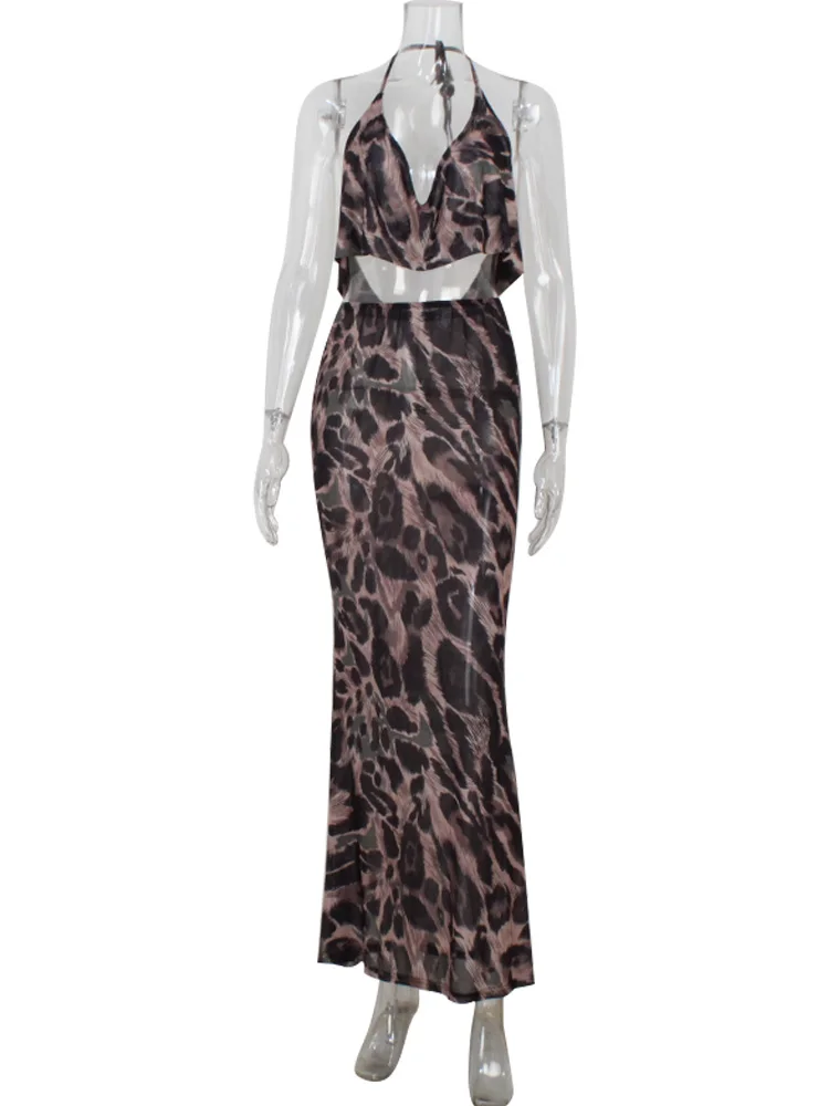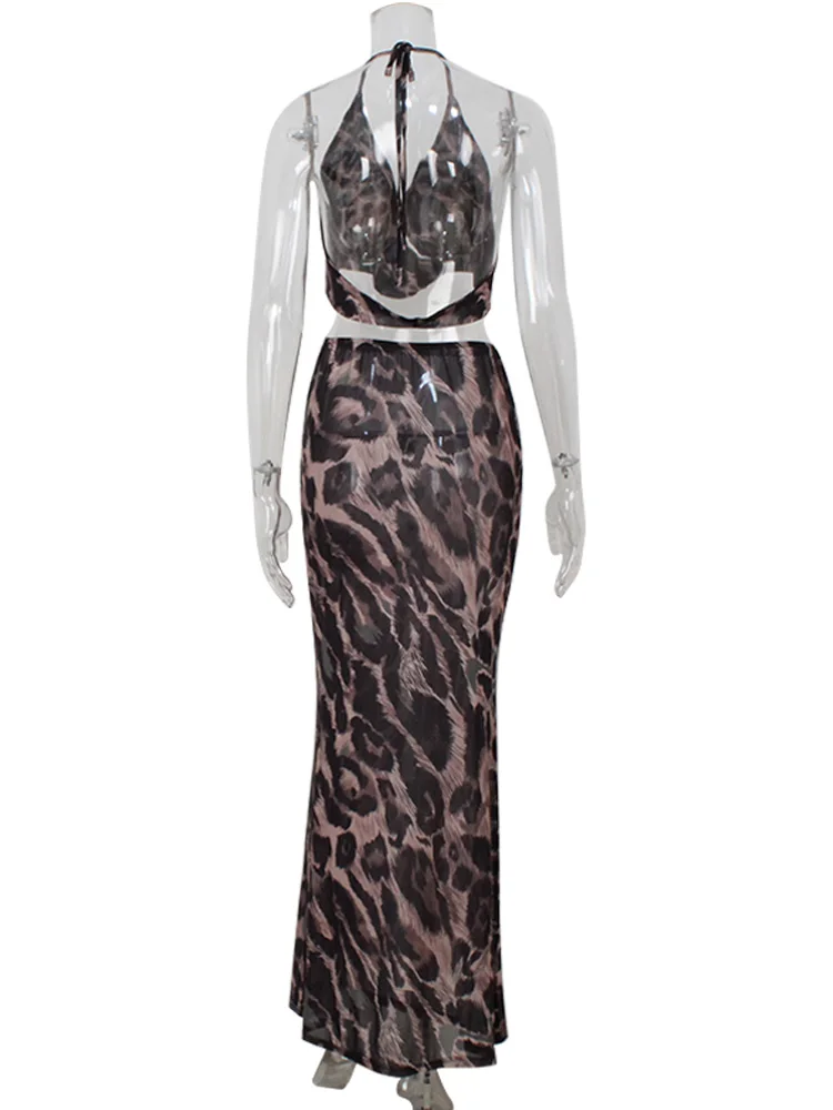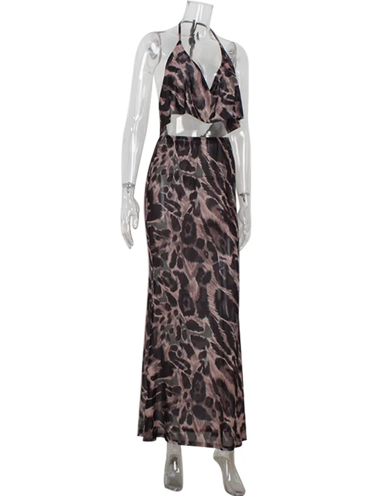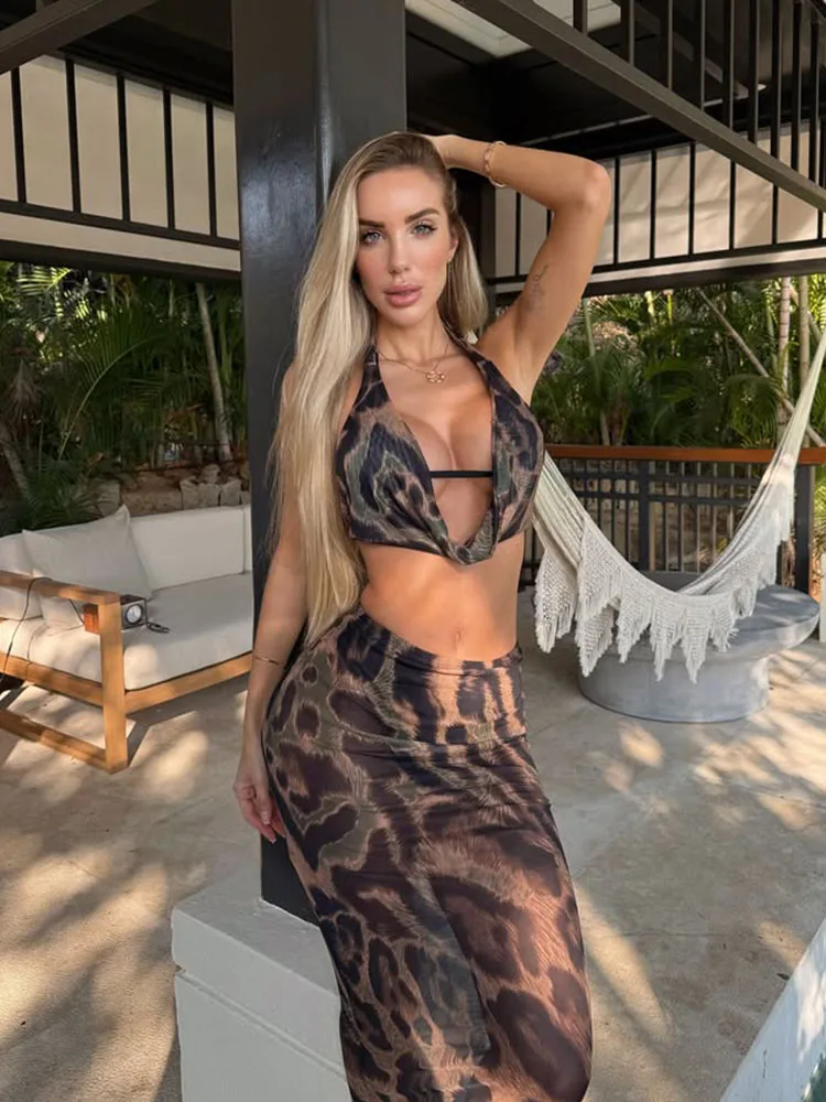Ahagaga Sexy Club Women's Sets Suits Print Halter V-Neck Backless Beach Style Bandage Sheath Skinny 2Pcs (Tops+Skrit) Tracksuits
