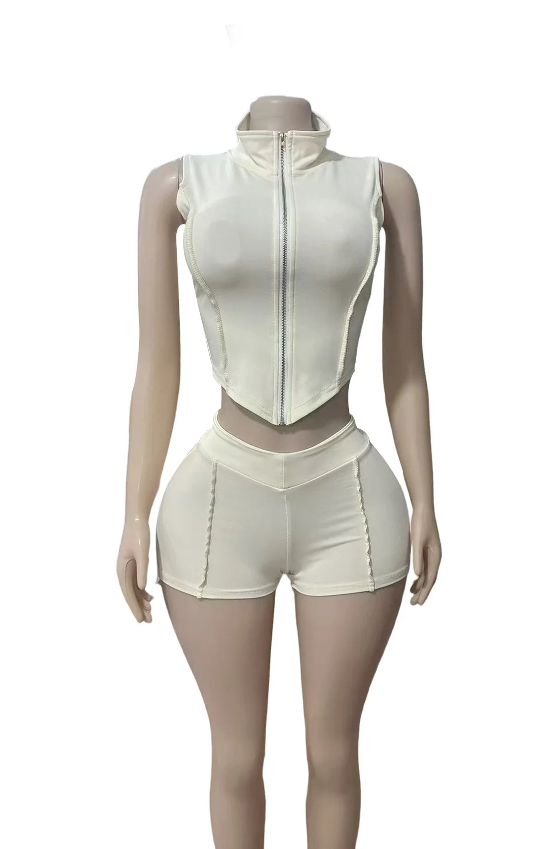 Fitness Women 2 Piece Set Zipper Fly Sleeveless Crop Top Skinny Biker Shorts Matching Set 2025 Summer New Popular Tracksuits