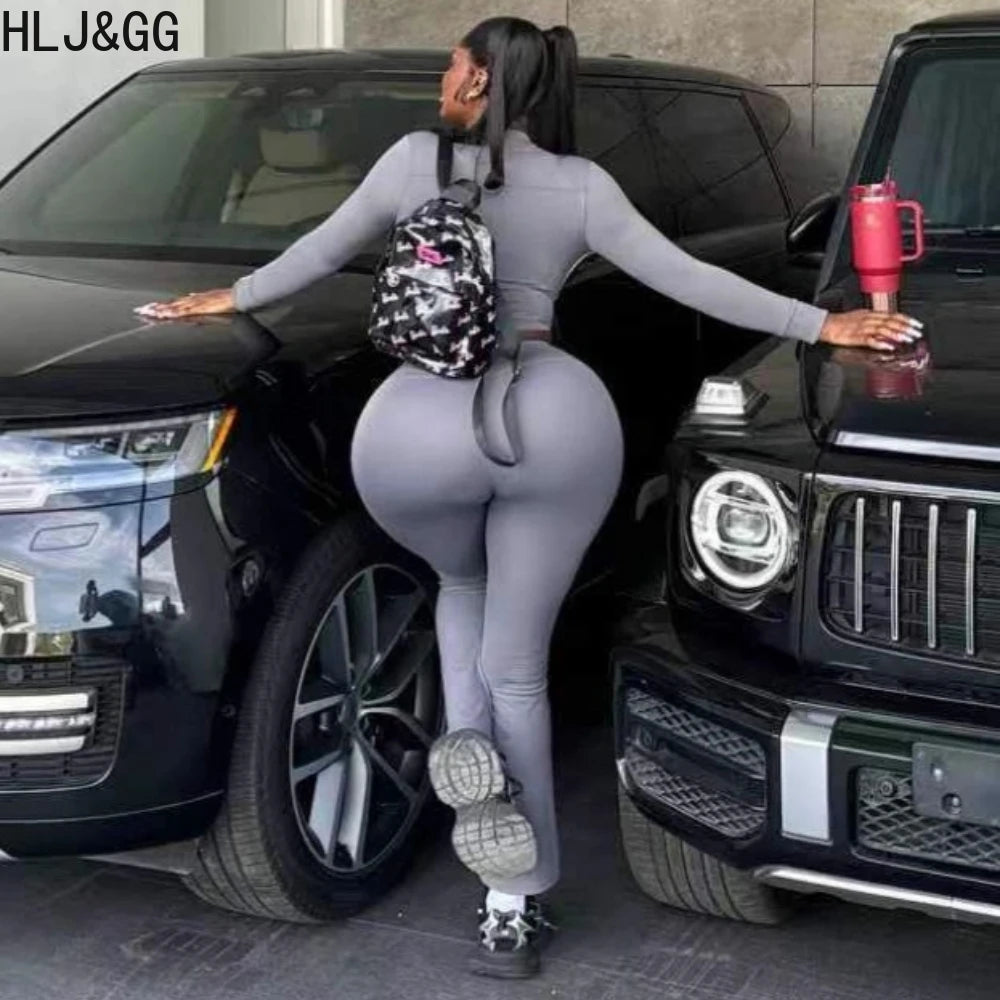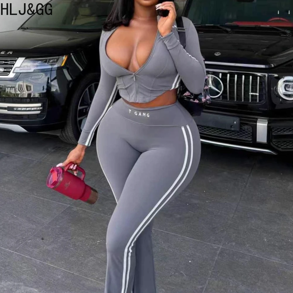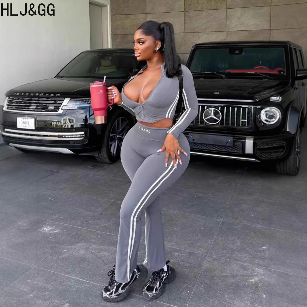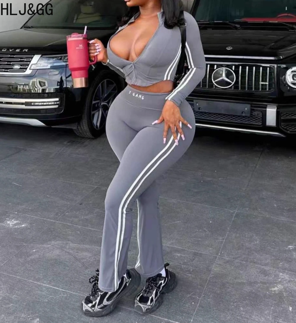 Prompearl Gray Fashion Stripe Print Skinny Pants Two Piece Sets Women